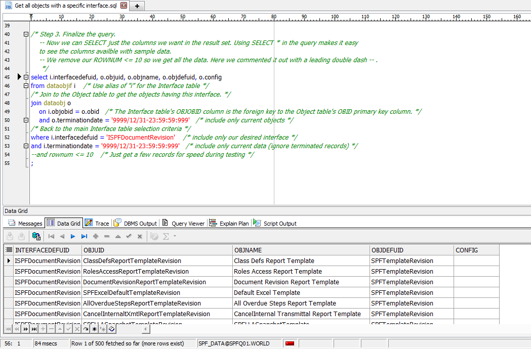 /* Step 3. Finalize the query. -- Now we can SELECT just the columns we want in the result set. Using SELECT * in earlier versions of the query makes it easy to see the columns available with sample data. -- We remove our ROWNUM <= 10 so we get all the data. Here we commented it out with a leading double dash -- . */ select i.interfacedefuid, o.objuid, o.objname, o.objdefuid, o.config from dataobjif i /* Use alias of "i" for the Interface table */ /* Join to the Object table to get the objects having this interface. */ join dataobj o on i.objobid = o.obid /* The Interface table's OBJOBID column is the foreign key to the Object table's OBID primary key column. */ and o.terminationdate = '9999/12/31-23:59:59:999' /* include only current objects */ /* Back to the main Interface table selection criteria */ where i.interfacedefuid = 'ISPFDocumentRevision' /* include only our desired interface */ and i.terminationdate = '9999/12/31-23:59:59:999' /* include only current data (ignore terminated records) */ --and rownum <= 10 /* Now we comment this out to get all records */ ;